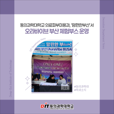 우리대학 의료피부미용과는 지난 11월 7일(금)부터 8일(토)까지 양일간 부산시민공원 다솜광장에서 열린 제9회 맘편한부산 행사에 참여해, '오라바이브 부산(ORA VIBE Busan)'이라는 이름으로 오라(에너지) 측정 체험부스를 운영하였어요✨ '맘편한부산'은 부산광역시와 국제신문이 공동 주최한 임신·출산·육아 의료정보 박람회로, '행복한 가족, 건강한 부산'을 주제로 시민들에게 건강하고 따뜻한 가족 문화를 확산시키기 위해 열렸는데요! 행사에는 부산 지역 의료기관, 공공기관, 기업, 교육기관 등이 참여해 다양한 체험과 전시를 선보였답니다(●'◡'●) 제9회 맘편한부산 '오라바이스 부.......