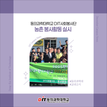 우리대학 DIT사회봉사단이 지난 14일부터 15일까지 양일간 경남 양산시 원동면에 위치한 선리마을에서 농촌 봉사활동을 실시하였어요 지난 2008년 경남 양산 선리마을과 1교 1촌 자매결연을 맺은 우리대학교는 매년 농작물 수확기를 비롯한 특정 시기에 인력난을 겪고 있는 농가를 지원하기 위해 일손 돕기 및 환경정화 등 다양한 봉사활동을 추진하고 있답니다! 재학생과 교직원 36여 명이 참가한 DIT사회봉사단은 마을 공동경작지에서 사과 수확 및 포장, 농수로 및 마을 주변 청소 정리 등의 작업을 통해 농촌의 부족한 일손을 도왔어요. 육체적으로 힘든 것보다 농촌 지역의 삶을 직접 체험해 보는 즐거움이 더 컸다. 이번 기회.......